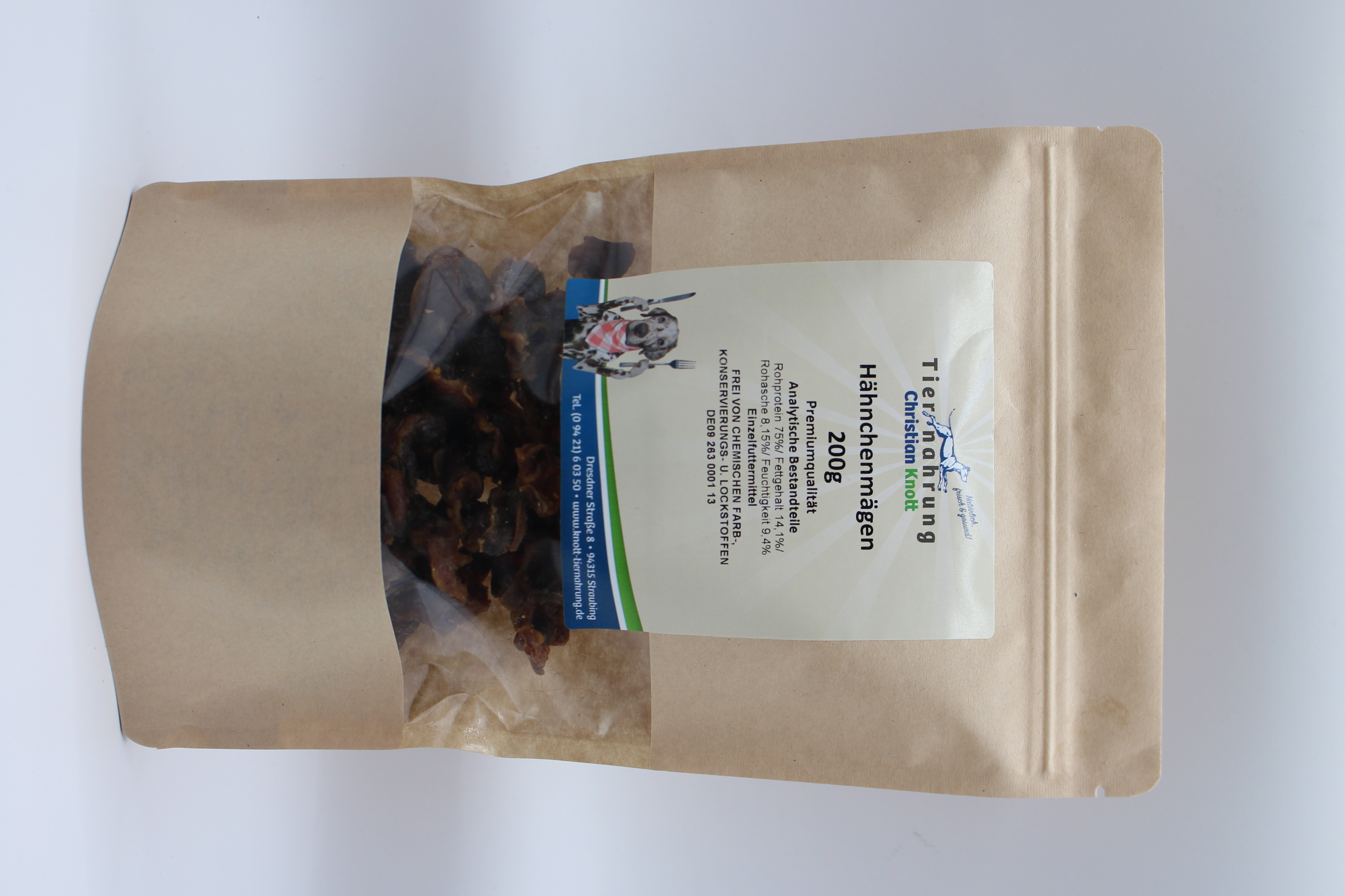 Unsere Hähnchenmägen bestehen zu 100% aus reinem Hähnchenfleisch und bieten deinem Hund einen besonders aromatischen, naturbelassenen Kausnack. Durch die schonende Trocknung bleibt der natürliche Geschmack erhalten. Die Mägen sind geruchsarm und kommen ohne zusätzliche Konservierungs-, Farb- oder Lockstoffe aus.