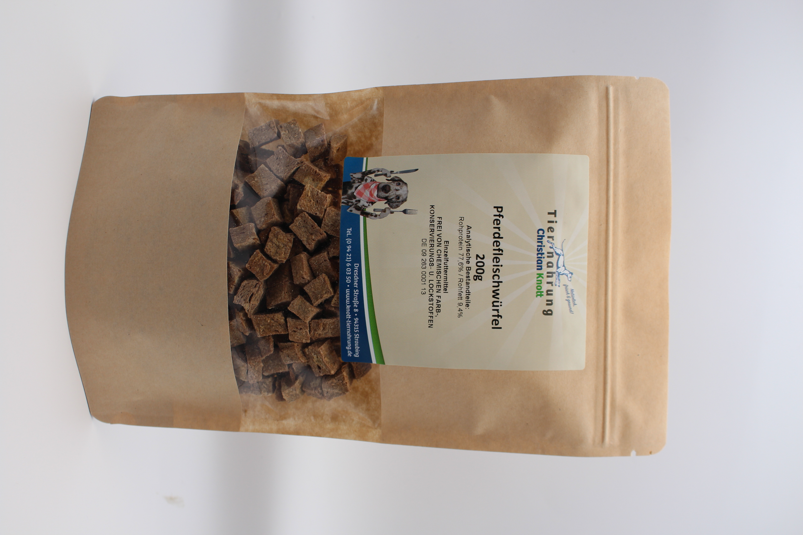 Die Pferdefleischwürfel eignen sich aufgrund der Größe hervorragend als kleine Belohnung zwischendurch oder beim Training.